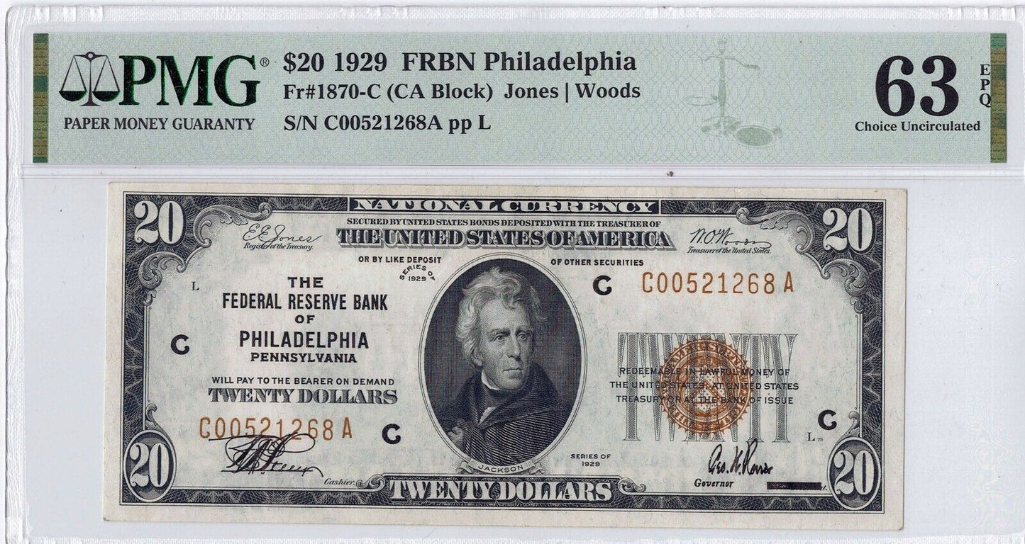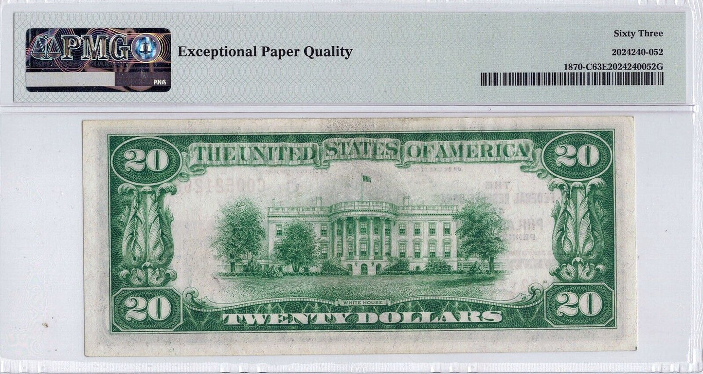 1929 $20 PMG EPQ 63 Philadelphia, Penn. Federal Reserve Bank Note ☆☆ Fr#1870 ☆☆